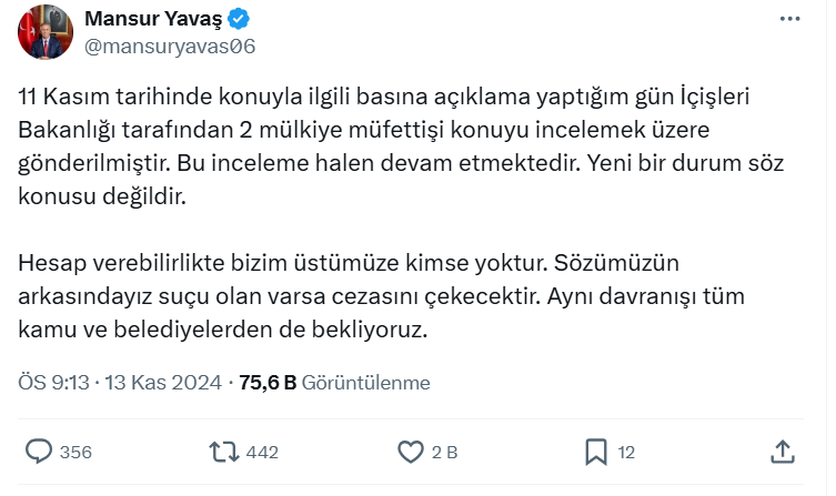 Ankara Büyükşehir Belediye Başkanı Mansur Yavaş, sosyal medya platformu X üzerinden yaptığı açıklamada, konuyla ilgili daha önce kamuoyuna bilgi verdiğini belirtti. Yavaş, “11 Kasım’da basına açıklama yaptığım gün, İçişleri Bakanlığı tarafından 2 mülkiye müfettişi konuyu incelemek üzere görevlendirilmiştir. Bu inceleme devam etmektedir, yeni bir durum yoktur. Hesap verebilirlikte bizim üstümüze kimse yoktur. Sözümüzün arkasındayız, suçu olan varsa cezasını çekecektir. Aynı tutumu tüm kamu ve belediyelerden de bekliyoruz” ifadelerini kullandı.