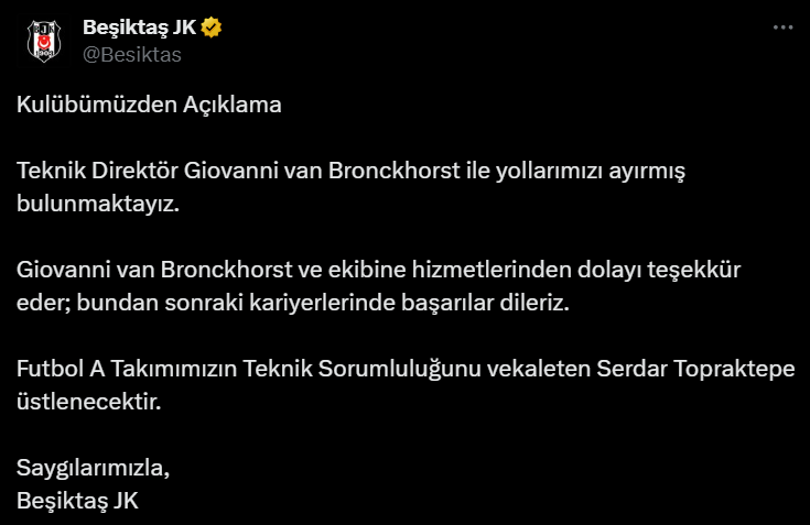 Üst üste alınan kötü sonuçların ardından Beşiktaş, teknik direktör Giovanni van Bronckhorst ile yollarını ayırma kararı aldı. Takımın başına Serdar Topraktepe’nin vekaleten geçeceği açıklandı.