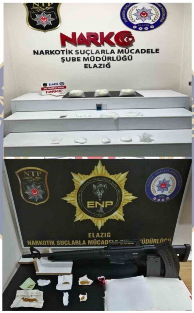 Elazığ Cumhuriyet Başsavcılığı’nın koordinasyonunda, İl Emniyet Müdürlüğü Narkotik Suçlarla Mücadele Şube Müdürlüğü tarafından uyuşturucu ile mücadele kapsamında uyuşturucu madde kullananlara ve sokak satıcılarına yönelik operasyon düzenlendi. Operasyonlarda, 13 parça halinde 3 kilo 380 gram metamfetamin, 5 parça halinde 314,28 gram sentetik kannabinoid, 2 parça halinde 28 gram esrar, 2.65 gram bonzai, 48 adet sentetik ecza, 1 pompalı tüfek, 1 hassas terazi ele geçirildi.