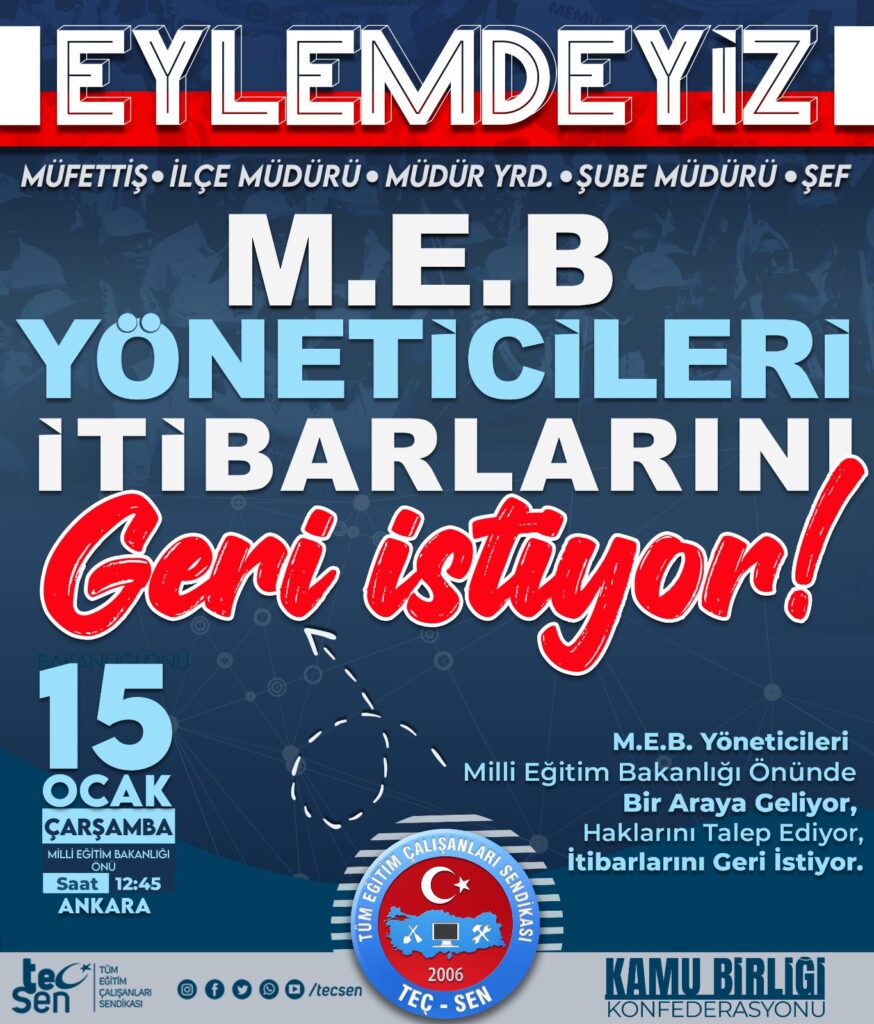Uzman ve Başöğretmenlik düzenlemeleriyle öğretmenlere sağlanan maddi iyileştirmelerin, Milli Eğitim Bakanlığı yöneticilerine de yansıtılması gerektiğini belirten yöneticiler, “Yönetim Görevi Karşılığı Ek Ders Ücreti” ödemesinin geri getirilmesini talep ediyor. Bu doğrultuda, Milli Eğitim Bakanlığı’nda görev yapan ilçe müdürleri, il milli eğitim müdür yardımcıları, şube müdürleri, müfettişler, şefler ve avukatlar, 15 Ocak 2025 tarihinde, saat 12:40’ta Milli Eğitim Bakanlığı önünde toplanarak, koltuklarını Bakanlık önüne bırakıp bir basın açıklaması gerçekleştirecekler.