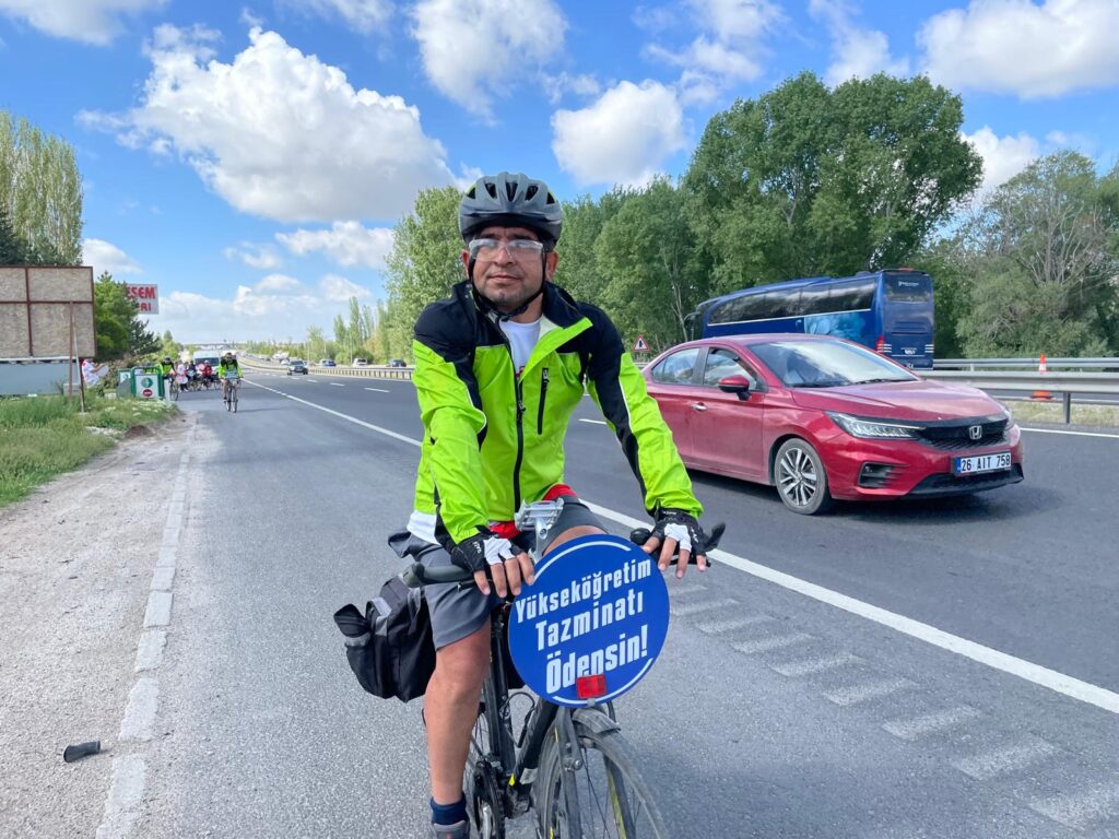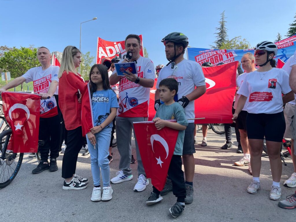 Üniversite İdari Personel Sendikası (ÜNİPERSEN) ve Tüm Eğitim Çalışanları Sendikası (TEÇ-SEN) üyeleri, kamu çalışanlarının yıllardır çözüm bekleyen sorunlarını gündeme taşımak ve 8. Dönem Toplu Sözleşme sürecine dikkat çekmek amacıyla Eskişehir’den Ankara’ya bisikletle geldi. Üç gün süren pedal yolculuğunun ardından, Çalışma ve Sosyal Güvenlik Bakanlığı önünde basın açıklaması yapan sendika üyeleri, “Artık ‘mış gibi’ yapılan görüşmeler değil, gerçek kazanımlar görmek istiyoruz” mesajı verdi.